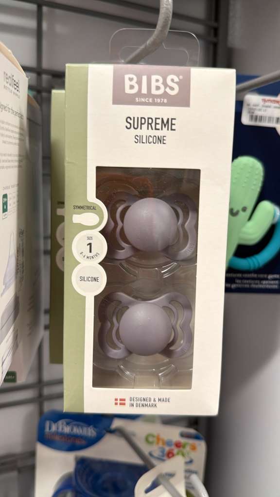 La imagen muestra un paquete de dos chupetes (pacifiers) BIBS Supreme Silicone. Son simétricos, talla 1, aptos para bebés de 0 a 6 meses, y están hechos de silicona. El color es un lila o morado claro. El empaque indica que están diseñados y fabricados en Dinamarca. El precio indicado es $4.00. El contexto activo era «Accesorios». Se estima un peso base de 0.1 kg para un paquete de dos chupetes, más 0.1 kg de margen para el empaque, resultando en un peso calculable de 0.2 kg.