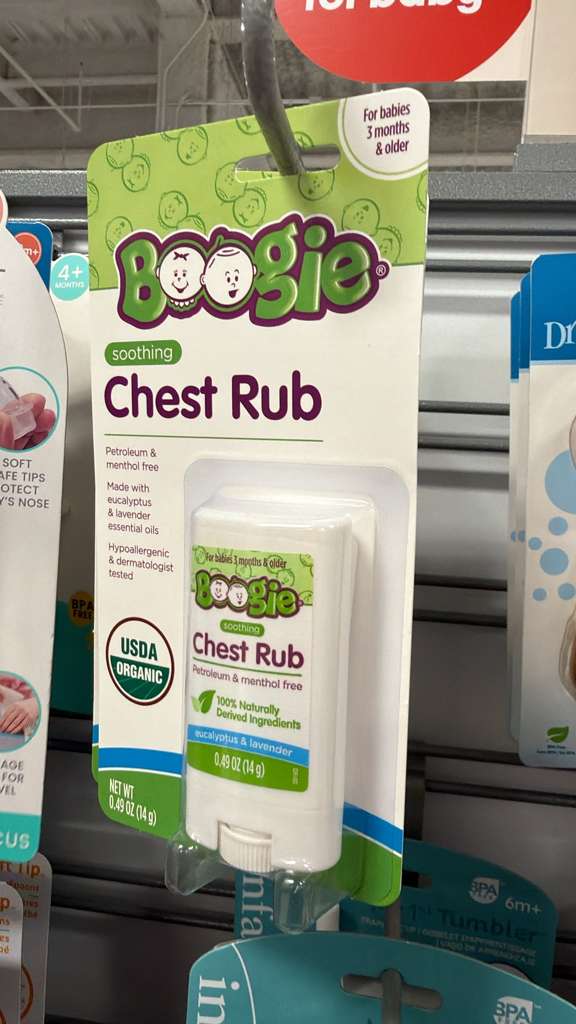 La imagen muestra un bálsamo para el pecho (Soothing Chest Rub) de la marca Boogie, diseñado para bebés de 3 meses o más. Es libre de petróleo y mentol, y está hecho con aceites esenciales de eucalipto y lavanda. Es hipoalergénico, probado por dermatólogos y cuenta con certificación USDA Organic. El peso neto es de 0.49 OZ (14g). El precio indicado es $4.99. El contexto activo era «Accesorios». Se estima un peso base de 0.1 kg para este producto, más 0.1 kg de margen para el empaque, resultando en un peso calculable de 0.2 kg.