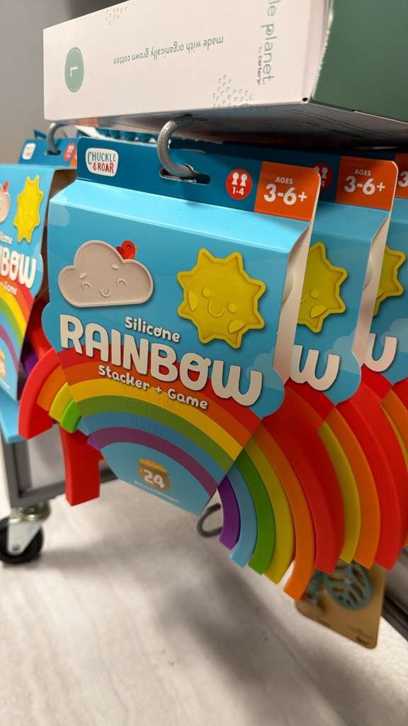 La imagen muestra un juguete apilable de silicona de la marca Chuckle & Roar, llamado «Silicone RAINBOW Stacker + Game». Incluye piezas de silicona que forman un arcoíris y figuras de una nube y un sol. El empaque indica que es apto para edades de 3 a 6+ años, y en otra sección menciona 1-4 años. El precio indicado es $7.00. El contexto activo era «Accesorios». Se estima un peso base de 0.2 kg para este tipo de juguete de silicona, más 0.1 kg de margen para el empaque, resultando en un peso calculable de 0.3 kg.