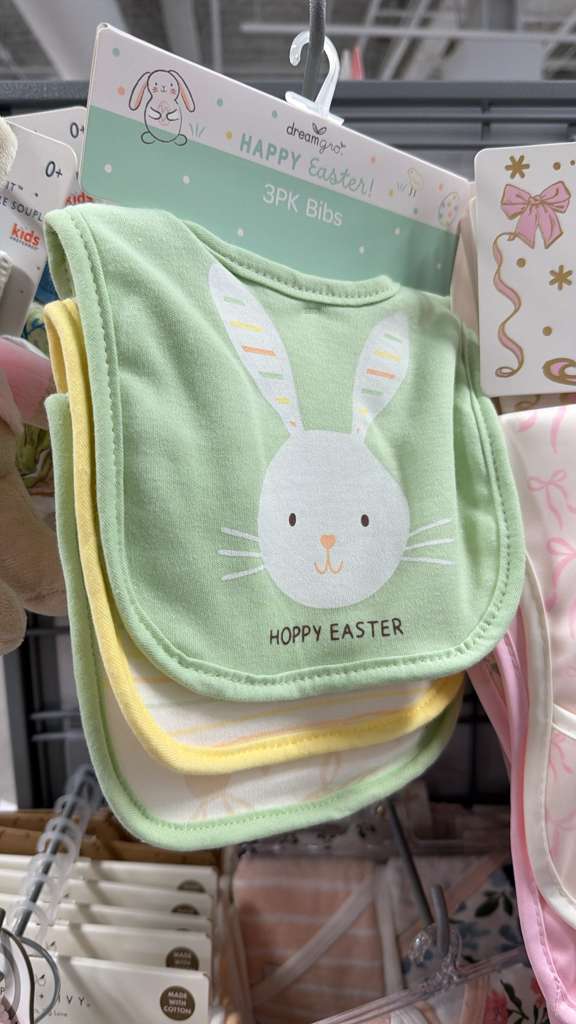 La imagen muestra un set de 3 baberos para bebé de la marca dreamgro, con temática de Pascua. El babero superior es verde con un estampado de un conejo blanco y la frase «HOPPY EASTER». También se puede ver un babero amarillo debajo. El texto en el empaque indica «dreamgro HAPPY Easter! 3PK Bibs» y «0+». El precio indicado es $4.99. Se estima un peso base de 0.2 kg para un set de 3 baberos ligeros, más 0.1 kg de margen para el empaque, resultando en un peso calculable de 0.3 kg.