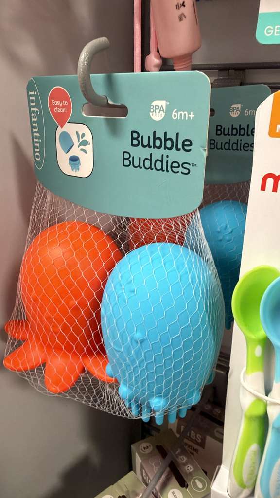 La imagen muestra un paquete de juguetes de baño «Bubble Buddies» de la marca Infantino. Incluye dos juguetes con forma de pulpo o calamar, uno de color naranja y otro azul, presentados en una red. Son libres de BPA y aptos para bebés de 6 meses en adelante. El empaque indica que son fáciles de limpiar. El precio indicado es $7.99. El contexto activo era «Accesorios». Se estima un peso base de 0.2 kg para este tipo de juguete pequeño, más 0.1 kg de margen para el empaque, resultando en un peso calculable de 0.3 kg.