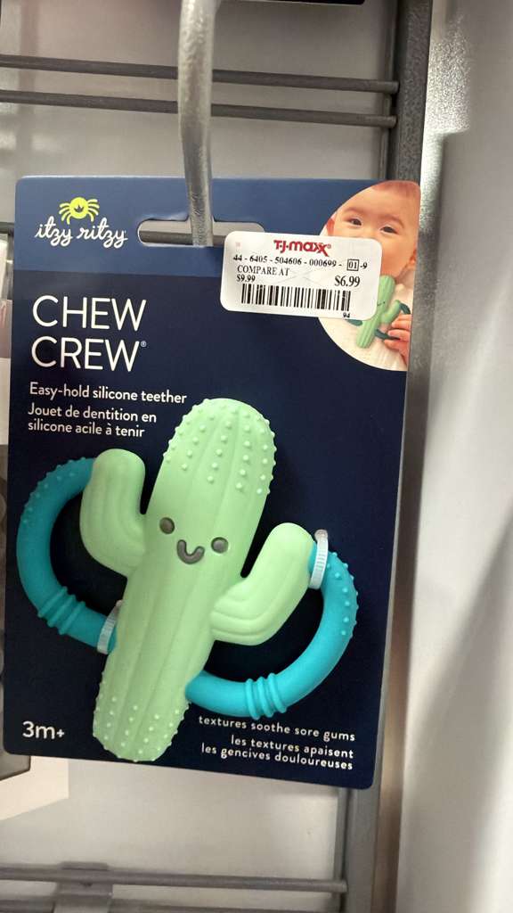 La imagen muestra un mordedor de silicona de la marca Itzy Ritzy, de la línea «Chew Crew», con forma de cactus de color verde claro y anillos azules texturizados. El empaque indica que es un mordedor de silicona fácil de sujetar, apto para bebés de 3 meses en adelante, y que las texturas alivian las encías adoloridas. El precio indicado es $6.99. El contexto activo era «Accesorios». Se estima un peso base de 0.2 kg para este tipo de juguete pequeño, más 0.1 kg de margen para el empaque, resultando en un peso calculable de 0.3 kg.