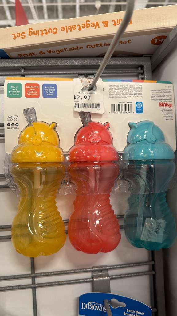 La imagen muestra un paquete de tres vasos antiderrame con caña de la marca Nuby, en colores amarillo, rojo y azul/verde. El empaque resalta que son fáciles de usar en movimiento (‘Flip-it’), tienen válvula que regula el flujo (‘TOUCH-FLO’) y son de agarre fácil para manos pequeñas (‘Easy Grip’). El precio indicado es $7.99. El contexto activo era ‘Accesorios’. Se estima un peso base de 0.4 kg para este tipo de producto (3 vasos), más 0.1 kg de margen para el empaque, resultando en un peso calculable de 0.5 kg.