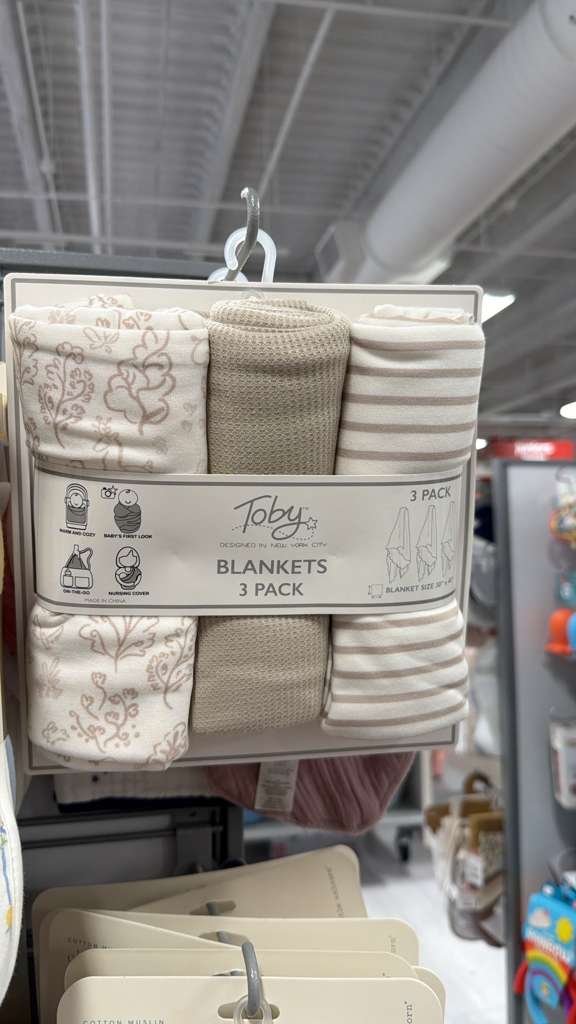 La imagen muestra un paquete de tres mantas para bebé de la marca Toby, diseñadas en Nueva York. Incluye tres mantas de 30″x40″: una con un patrón floral, una de punto con textura y una de rayas, todas en tonos neutros. Son adecuadas para mantener al bebé cálido, como primera manta, para llevar o como cubierta para la lactancia. El precio indicado es $12.99. El contexto activo era «Accesorios». Se estima un peso base de 0.8 kg para tres mantas, más 0.1 kg de margen para el empaque, resultando en un peso calculable de 0.9 kg.
