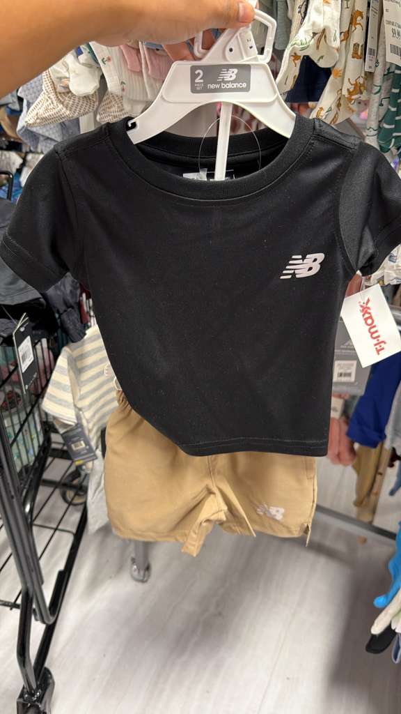 La imagen muestra un conjunto de dos piezas para bebé niño de la marca New Balance. Incluye un polo de manga corta de color negro con el logo blanco de New Balance en el pecho y un short liso de color caqui. El gancho indica ‘2 pc set’ y la marca ‘new balance’. El texto recibido indica un precio de $12.99 y el contexto activo es ‘BEBE NIÑO Talla 12M’. Se estima un peso base de 0.3 kg para el conjunto de ropa, más 0.1 kg de margen para el empaque, resultando en un peso calculable de 0.4 kg.