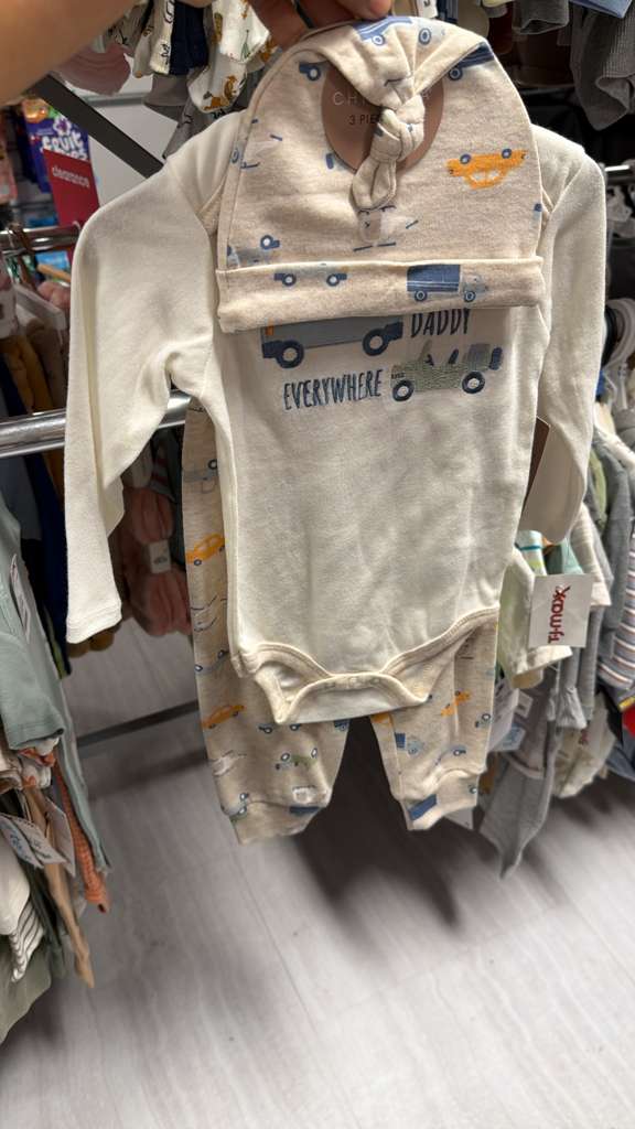 La imagen muestra un set de 3 piezas para bebé niño. Incluye un bodysuit de manga larga de color crema o blanco roto con un estampado frontal de camiones y la frase ‘DADDY EVERYWHERE’. También se aprecian unos pantalones a juego con un estampado repetido de camiones y un gorro anudado con el mismo estampado. Una etiqueta visible indica ‘3 PIECES’. El texto recibido indica un precio de $7.99, y el contexto activo es ‘BEBE NIÑO Talla 12M’. Se estima un peso base de 0.3 kg para el conjunto de ropa, más 0.1 kg de margen para el empaque, resultando en un peso calculable de 0.4 kg.