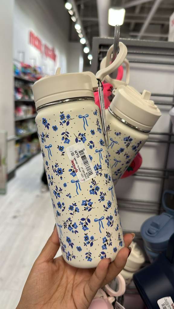 La imagen muestra una botella térmica de color crema con un estampado floral azul y pequeños lazos azules. Tiene una tapa del mismo color crema con un pitillo integrado. La etiqueta de precio visible indica $14.99, aunque la marca que se lee en la etiqueta es la del minorista TJ Maxx.