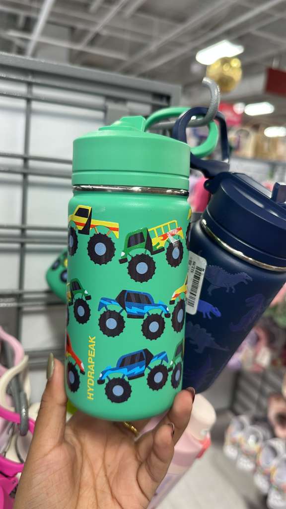La imagen muestra a una persona sosteniendo una botella térmica de color verde vibrante de la marca HYDRAPEAK. La botella está decorada con un patrón de varios camiones monstruo de diferentes colores (amarillo, verde, azul). Tiene una tapa verde a juego con un asa. En el fondo, se puede ver parcialmente otra botella térmica de color azul oscuro con diseños de dinosaurios. El texto recibido indica un precio de $12.99 y menciona que el producto «Mantienen contenido a temperatura por horas».