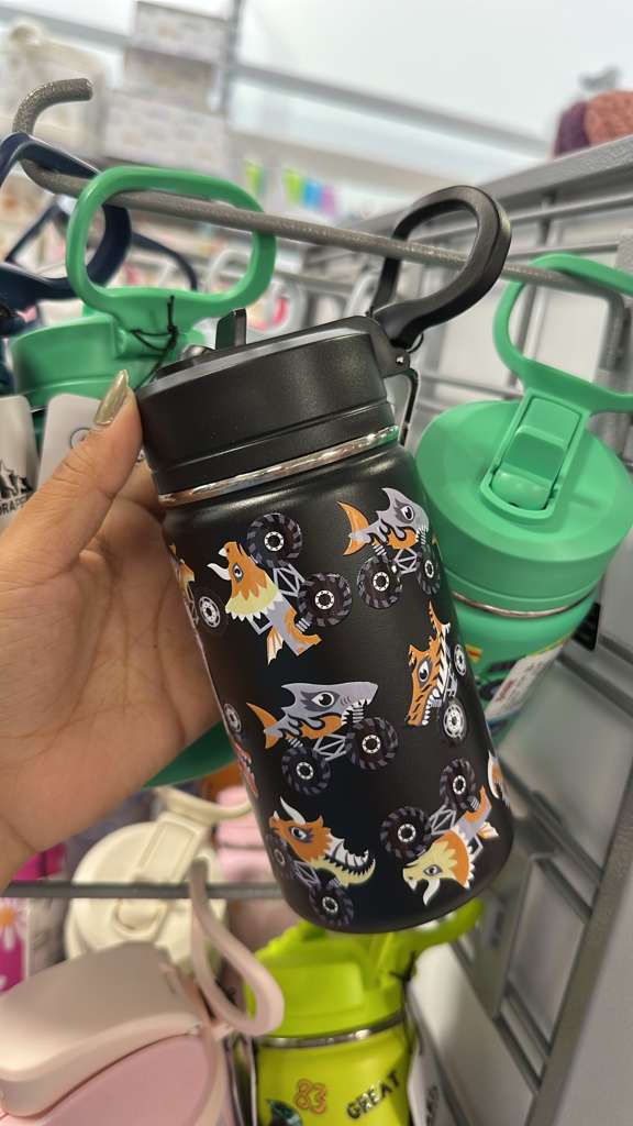 La imagen muestra una botella térmica de color negro con un diseño vibrante de monster trucks. Algunos de los monster trucks tienen características de animales, como tiburones y criaturas con cuernos, en tonos anaranjados, grises y amarillos. La botella tiene una tapa negra con un asa integrada. En el fondo, se pueden ver otras botellas, incluyendo una de color verde claro. El texto recibido indica un precio de $12.99 y que el producto «Mantienen contenido a temperatura por horas».