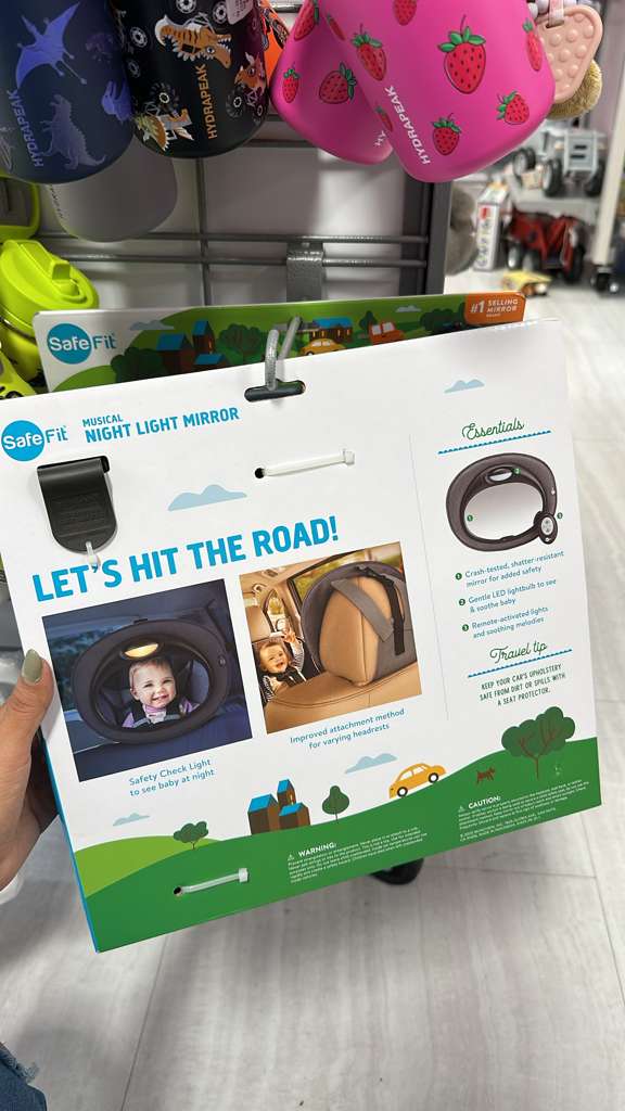 La imagen muestra el empaque de un espejo musical con luz nocturna de la marca Safe Fit, diseñado para ver al bebé en el asiento del auto por la noche. En el empaque se pueden ver imágenes del espejo instalado en un coche, mostrando a un bebé. El producto es descrito como «Crash-tested, shatter-resistant mirror for added safety», con «Gentle LED lightbulb to see & soothe baby» y «Remote-activated lights and soothing melodies». El texto recibido indica un precio de $9.99.
