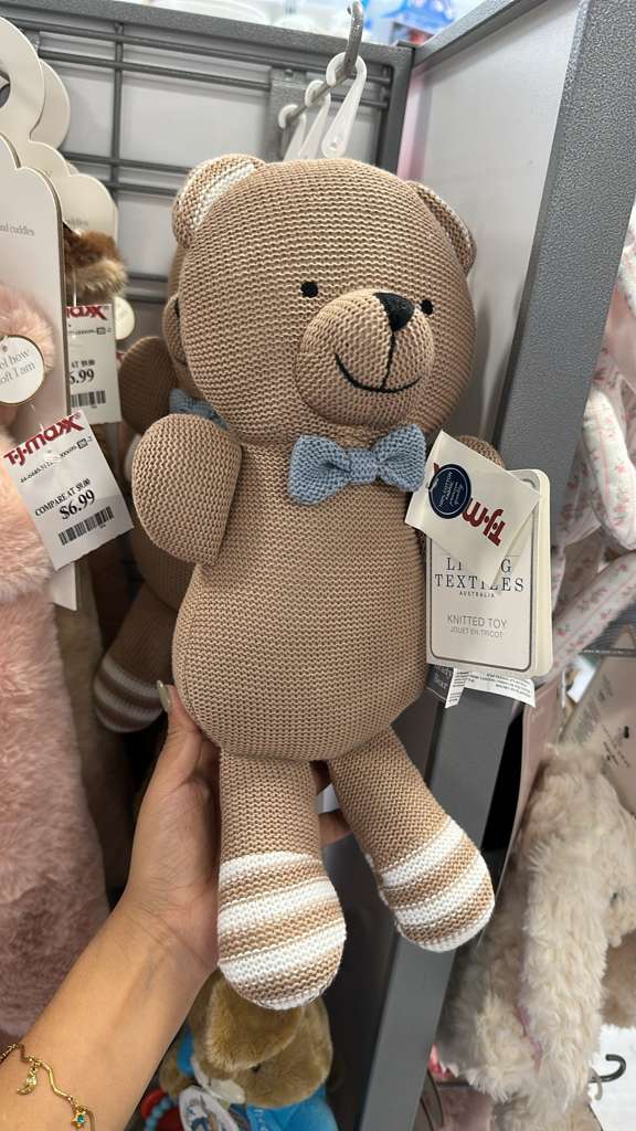 La imagen muestra un peluche de oso tejido de color marrón claro, con detalles en las orejas y en las patas en un tono más claro y rayas blancas. El oso lleva una pequeña corbata de lazo azul claro en el cuello y tiene una nariz negra bordada y una boca sonriente. A un lado del oso se observa una etiqueta que indica la marca «LIVING TEXTILES» y que es un «KNITTED TOY». El texto recibido indica un precio de $9.99.