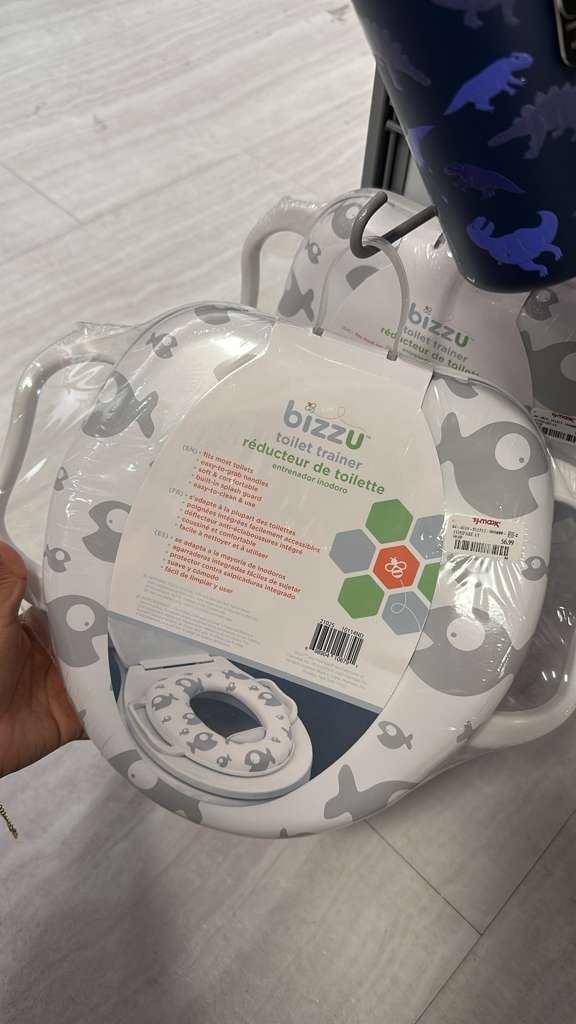 La imagen muestra un asiento entrenador para inodoro de la marca Bizzu, diseñado para niños. Es de color blanco con un patrón de elefantes y peces de color gris claro. El producto viene en su empaque original de plástico transparente. Tiene asas fáciles de agarrar y es un cojín suave y cómodo. Una etiqueta de precio de TJ Maxx es visible, indicando que el precio original era de $9.99 y el precio de oferta es de $6.99.
