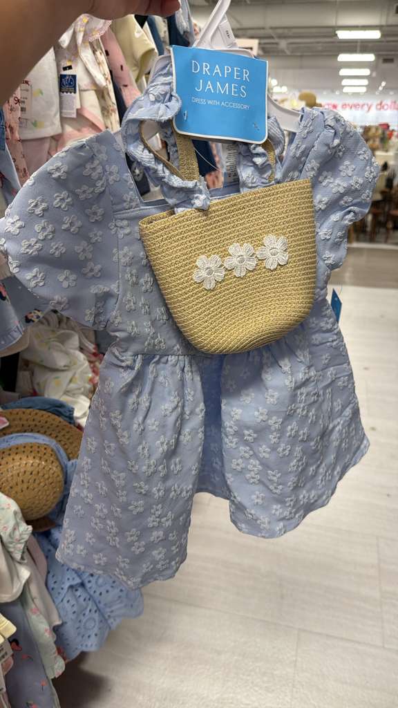 La imagen muestra un vestido de niña de la marca Draper James, de color azul claro con un delicado estampado floral blanco en relieve. El vestido presenta mangas cortas abullonadas, un escote cuadrado y una falda ligeramente fruncida. Incluye una pequeña cartera de mano tipo mimbre o paja en tono natural, decorada con tres pequeñas flores blancas, que cuelga del vestido. El texto recibido indica un precio de $14.99. El contexto activo es «Ropa Niña Talla 2T». Se estima un peso base de 0.3 kg para el vestido y la cartera, más 0.1 kg de margen para el empaque, resultando en un peso calculable de 0.4 kg.