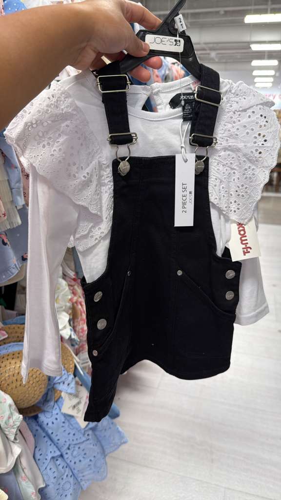 La imagen muestra un conjunto de dos piezas para niña de la marca Joe’s. Consiste en una blusa blanca de manga larga con detalles de encaje calado (broderie) y volantes en los hombros, y un overol o jardinera de mezclilla (jean) negro. El overol tiene tirantes ajustables y botones metálicos en los costados y en los bolsillos frontales. Las etiquetas visibles indican ‘2 PIECE SET’ y la marca ‘JOE’S’. La talla indicada en la percha es ‘2T’. El texto recibido indica un precio de $14.99. El contexto activo es ‘Ropa Niña Talla 2T’. Se estima un peso base de 0.6 kg para este conjunto de ropa, más 0.1 kg de margen para el empaque, resultando en un peso calculable de 0.7 kg.