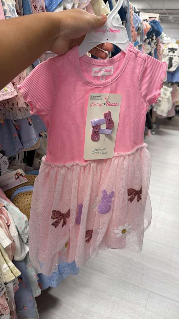 La imagen muestra un vestido de niña de la marca Young Hearts. La parte superior es de punto acanalado de color rosa claro con mangas cortas abullonadas. La falda es de tul rosado con purpurina y está decorada con apliques de conejitos morados, lazos marrones brillantes y margaritas blancas. El vestido viene con dos clips para el cabello a juego en forma de conejitos de purpurina. El texto recibido indica un precio de $12.99. El contexto activo es «Ropa Niña Talla 2T». Se estima un peso base de 0.3 kg para el vestido y los accesorios ligeros, más 0.1 kg de margen para el empaque, resultando en un peso calculable de 0.4 kg.