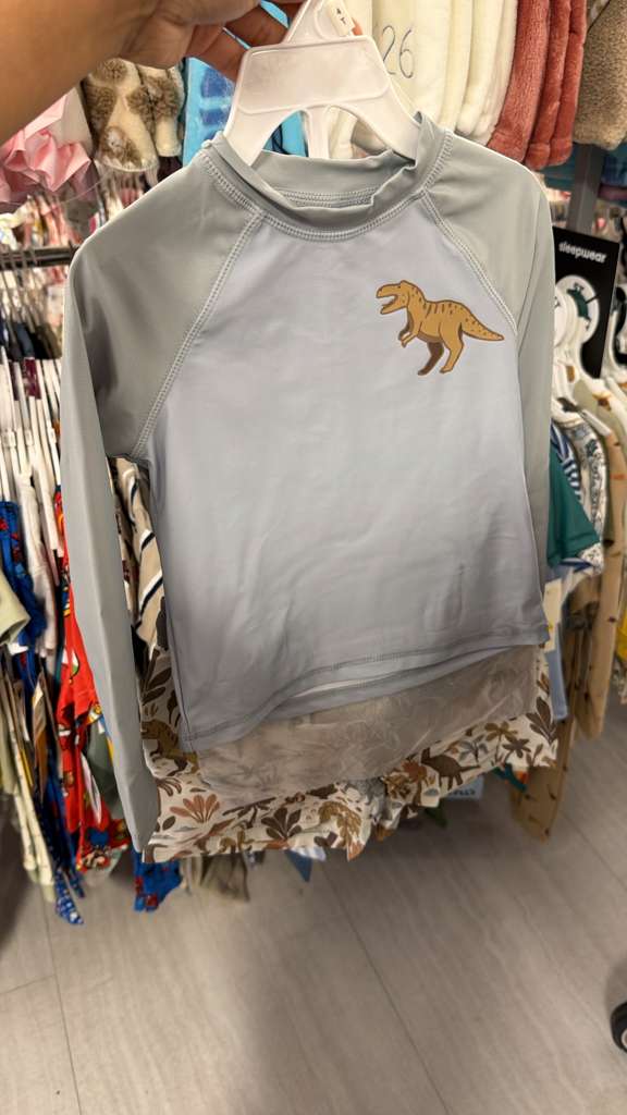 La imagen muestra un conjunto de ropa para niño, talla 4T. Consiste en un rashguard (polo de manga larga) de protección UV, de color gris claro en el cuerpo y gris oscuro en las mangas, con un estampado de un dinosaurio T-Rex de color marrón en el pecho. Debajo del rashguard se observa parte de unos shorts con un estampado de hojas y dinosaurios. El precio indicado es $14.99 y el contexto activo es ‘Ropa Niño Talla 4T’. Se estima un peso base de 0.4 kg para el conjunto (rashguard y shorts), más 0.1 kg de margen para el empaque, resultando en un peso calculable de 0.5 kg.