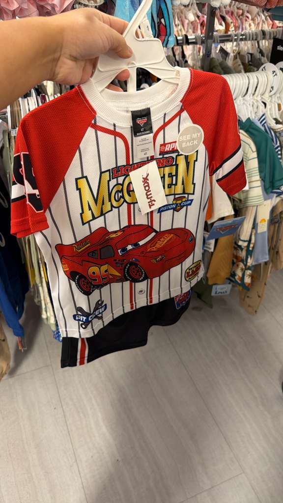 La imagen muestra un set de ropa para niño, talla 4T, inspirado en Lightning McQueen de Disney Cars. Consiste en una camiseta estilo béisbol de color blanco con rayas verticales rojas finas y mangas raglán rojas, y unos shorts negros. La camiseta tiene una gran ilustración de Lightning McQueen y el texto ‘LIGHTNING MCQUEEN’. La etiqueta de precio visible es de TJ Maxx por $12.99. El contexto activo es ‘Ropa Niño Talla 4T’. Estimando un peso base de 0.4 kg para el set de ropa de niño, más 0.1 kg de margen para el empaque, el peso calculable es de 0.5 kg.