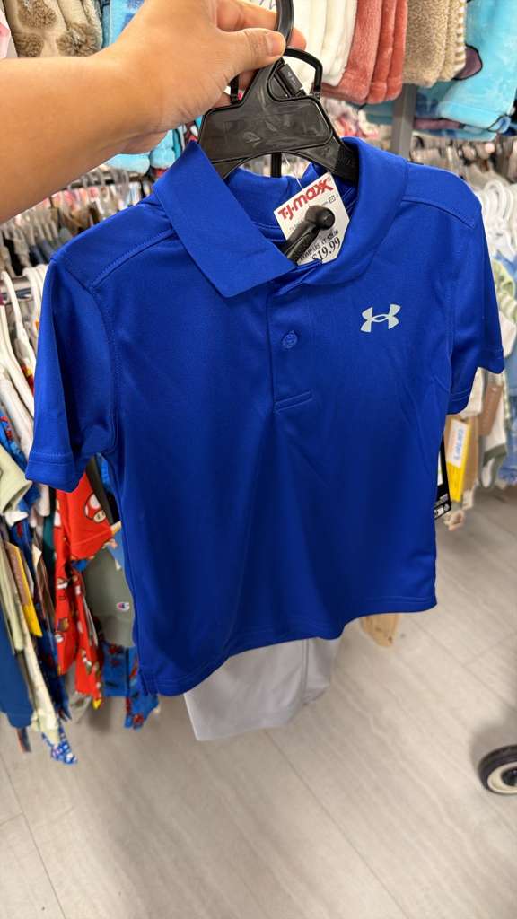 La imagen muestra un polo de manga corta de color azul royal para niño, talla 4T, de la marca Under Armour. Presenta un cuello clásico de polo, una solapa de dos botones y el logo de Under Armour en blanco en el pecho izquierdo. La etiqueta de precio de TJ-Maxx indica $19.99. El contexto activo es ‘Ropa Niño Talla 4T’. Estimando un peso base de 0.2 kg para una prenda liviana como un polo, más 0.1 kg de margen para el empaque, el peso calculable es de 0.3 kg.